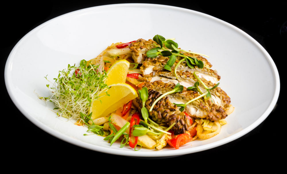 Pike perch in sunflower seeds served on spicy vegetables with rice noodles.